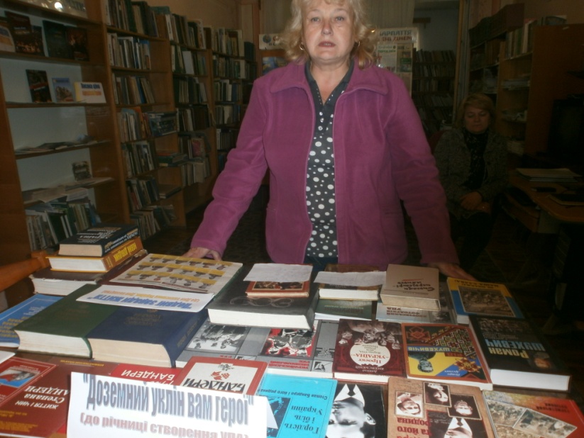Бібліотекар читального залу Сабадаш Н.А. розповіла історію створення УПА та провела бібліографічний огляд літератури по книгах представлених на книжковій виставці. УПА стала відповіддю на жорстоку окупаційну політику, що змусила українців організуватися у збройні підрозділи, котрі стали її частинами. Армії, через яку пройшло сто тисяч осіб, за участь у повстанському русі чи його підтримку, каральними органами СРСР було репресовано понад півмільйона людей.