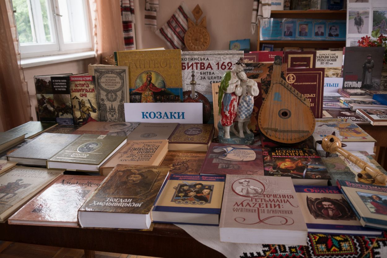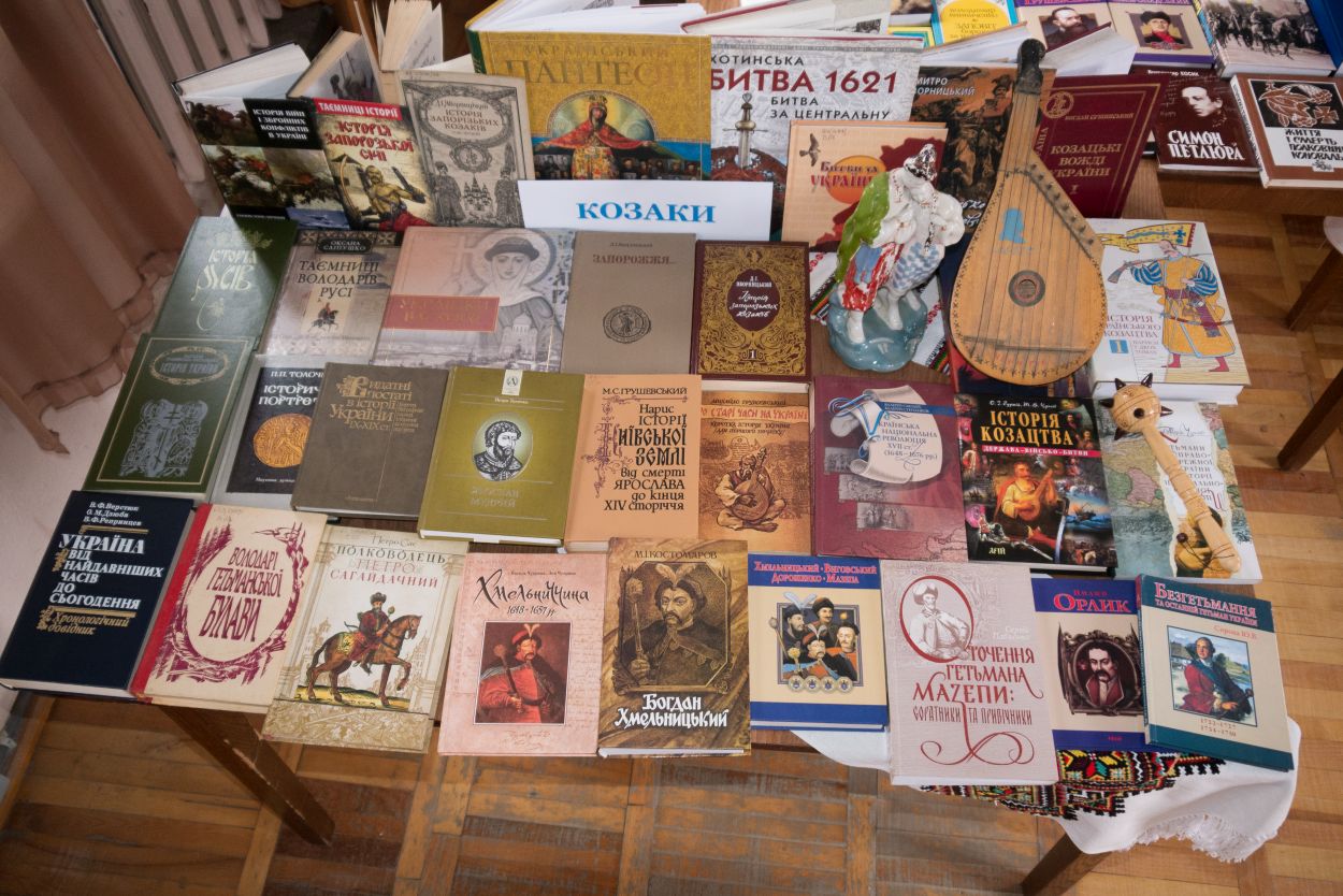 1 розділ – «Козаки» — представляє літературу із фондів Косівської книгозбірні про гетьманів, Запорізьку Січ та козаків, які захищали українську землю від нападів ворогів. Додатковим оформленням є булава, музичний інструмент – кобза, статуетка козака та дівчини, вишитий рушник.