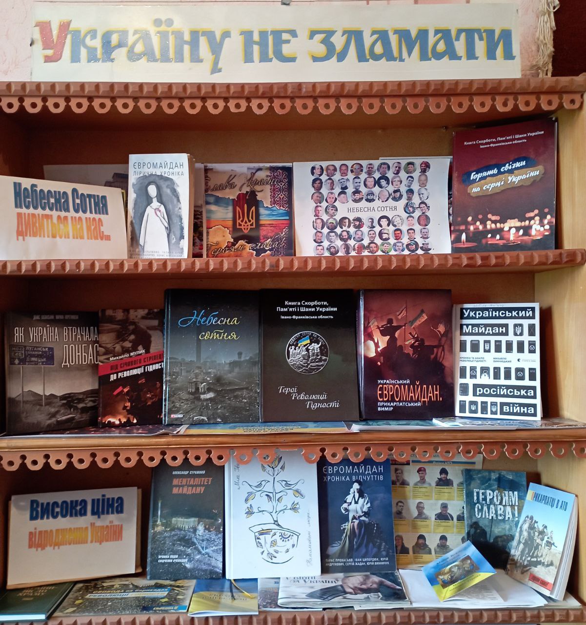 Книжкова виставка «Україну не зламати», яка організована в читальному залі Косівської ЦМБ вже вкотре нагадує користувачам про величезну самопожертву Героїв Небесної Сотні, якою ціною український народ здобував свободу, пам’ять про їх подвиг назавжди залишиться в наших серцях.